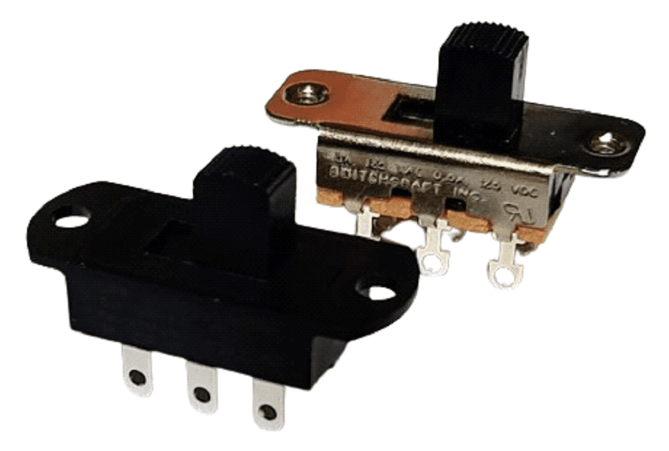 We use two types of Slide Power Switches, both featuring Silver-Plated, Double Pole/Double Throw (DP/DT) contacts for enhanced reliability and to extend switch life. The silver-colored switch, made by Switchcraft, is rated 5A @ 125VAC and is designed for use in the Dyna-70, and uses a 3A Fuse. Given the Dyna-70 usually only operates around 2.5 Amps, this switch should last the life of the amplifier. The Black Power Switch is for the Dyna-120 and is rated at 12 Amps @ 125VAC and uses a 5A Fuse.