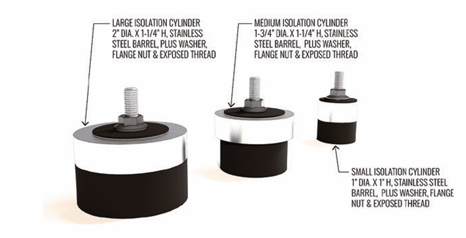 2″ Dia. x 3/4″H rubber cylinders, 2″ Dia. x 1/2″H brushed stainless steel barrels, rubber washers & flange nuts